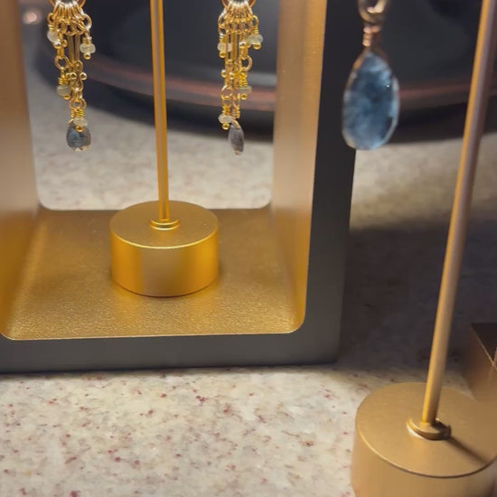 Elegant and eye-catching, these bronze earrings with an 18K gold overlay feature shimmering teal kyanite stones in a graceful multi-dangle design. The layered movement and rich ocean-hued gemstones add a sophisticated pop of color to both everyday and evening looks.